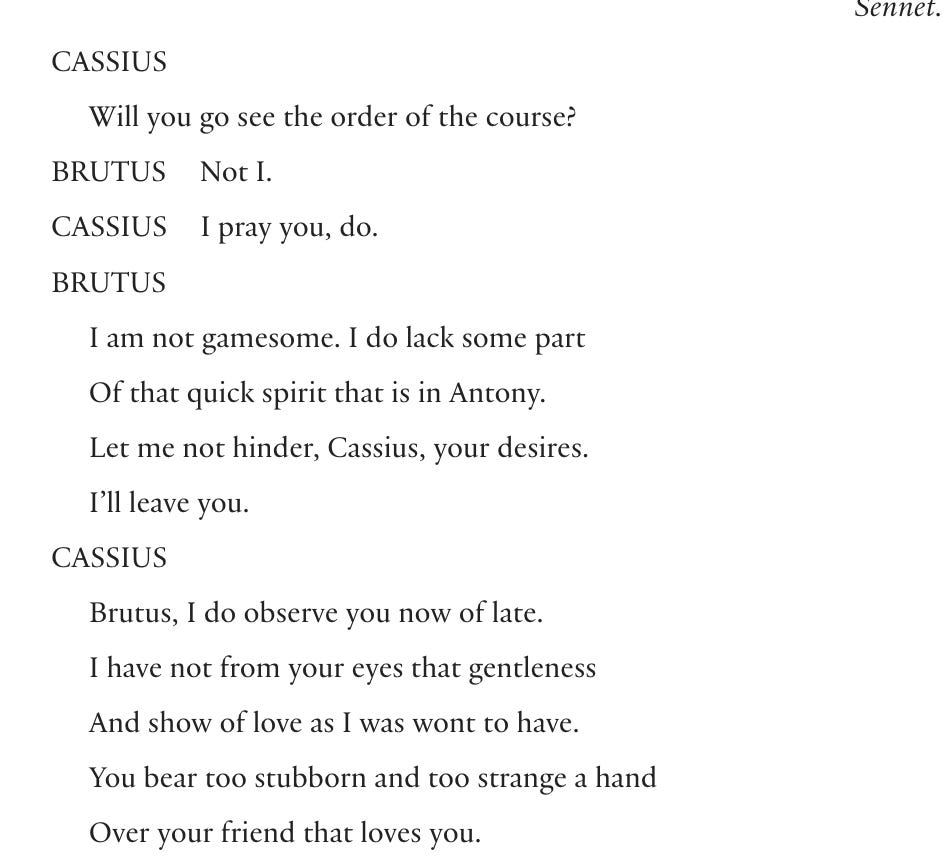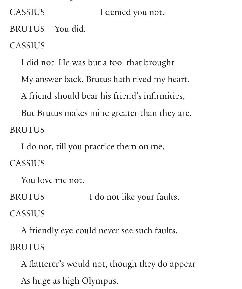 Brutus has the sort of relationship to death I’d expect from a history play – “If it comes, it comes; I hope it doesn’t, but we’re playing a high-stakes game and I’m prepared for whatever outcome,” whereas it’s Cassius’ first and seemingly only card in the pocket.3