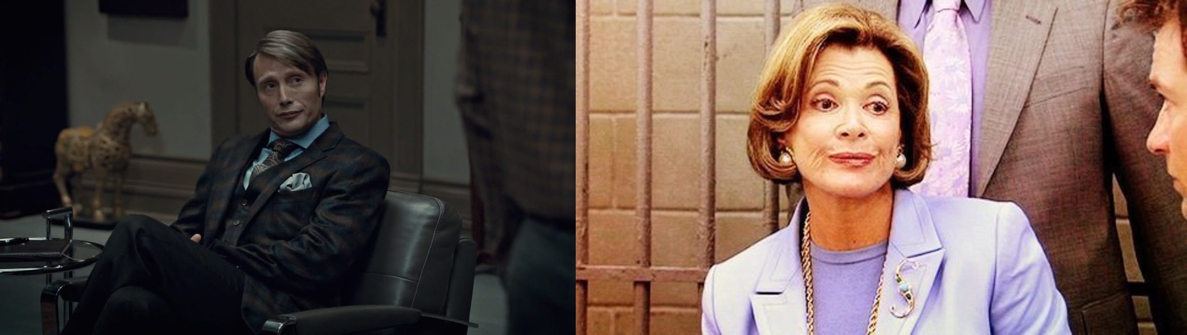 Why, so often, the impulse to say, this fictional character is like that fictional character? Why, so often, Imagine if she said what he had said? Imagine that. What if X, but Y? Sometimes – in this instance, at least – the point of the joy of discovery is the identification of pure Mommy energy, of the place where transfeminist horror studies and the sexual dynamics of my marriage intersect. Because the emotional withholding, meticulous dress, desperate desire for control/restriction/beauty when it comes to food and the body of both Hannibal Lecter (as portrayed by Mads Mikkelsen on NBC’s Hannibal) and Lucille Bluth (as portrayed by Jessica Walters on Fox/Netflix’s Arrested Development) are the same exquisite flower, blooming twice. Because Will Graham is part Lindsay Bluth (erring daughter, undisciplined in mind and body, in constant need of chastisement) and part Buster (cherished son, lost to himself, beyond hope, a mere extension of the maternal body, disempowered by its own lack of maternity). Because you can’t have it until you learn to ask for it. Also, same hat.