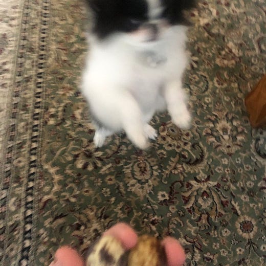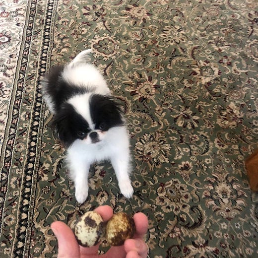We got really hung up on the suggested Google searches for “can dogs eat quail eggs,” which included Do dogs know to be gentle with babies?, What dogs can hold an egg in their mouth?, Why do dogs know to be gentle with babies?', What happens if you put an egg in a dog’s mouth?, and Why are dogs careful with eggs?