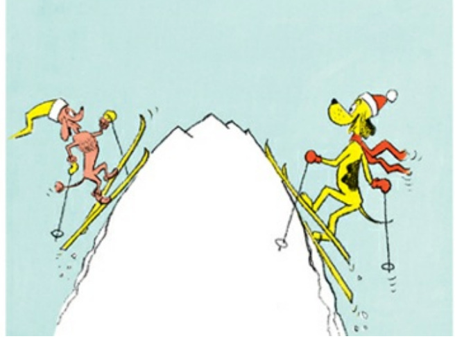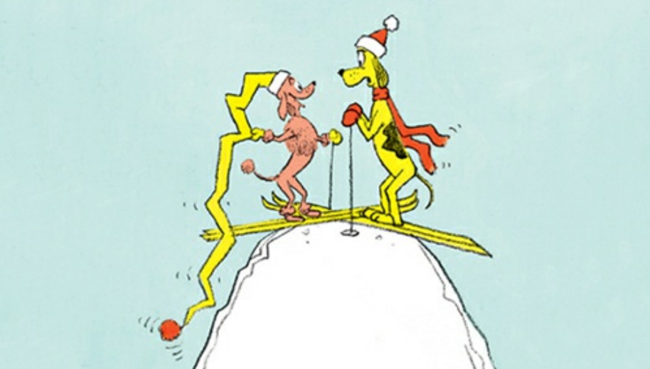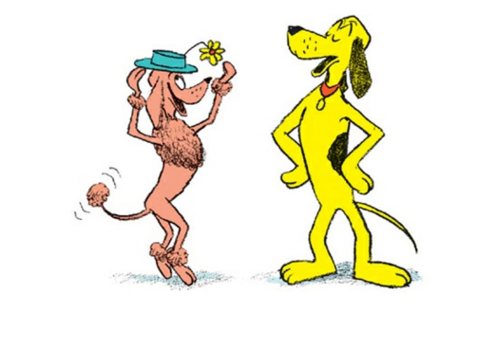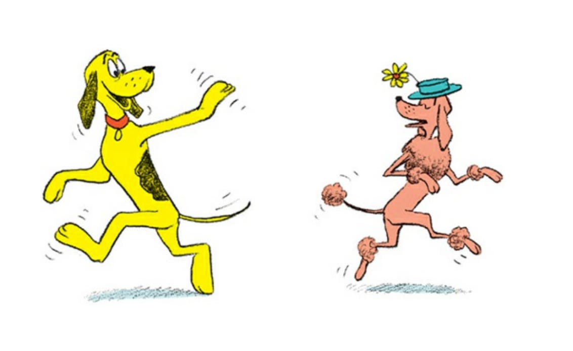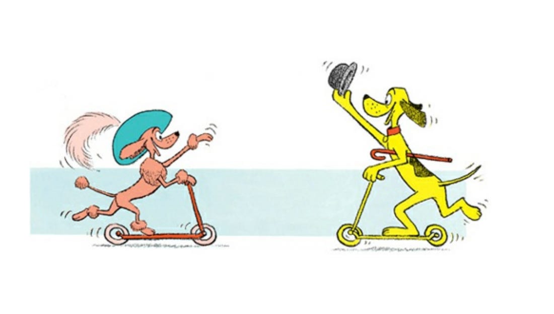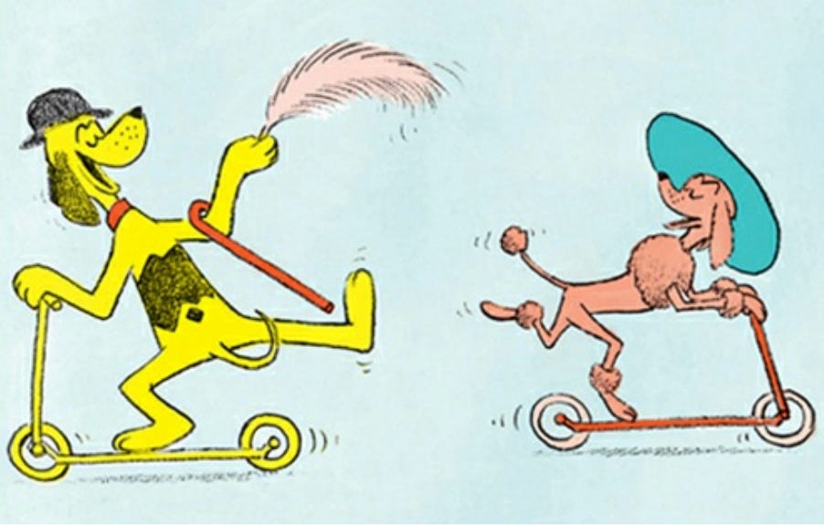 The only narrative to speak of in P.D. Eastman’s Go, Dog, Go follows the repeat encounters between a pink poodle and a yellow dog who might be part beagle. The rest of the book is in a taxonomical style; here is a green dog over a tree, here is a yellow dog under a tree, here are dogs in cars, here are big dogs going up, here are little dogs going down, that sort of thing.