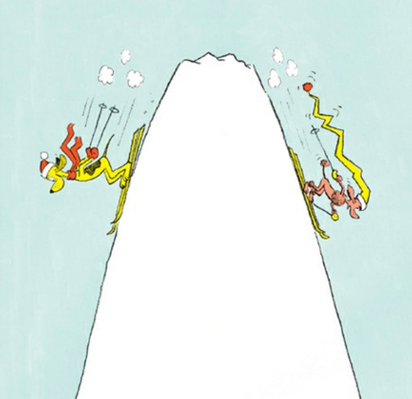 This time, I think we can fairly say he appears self-conscious when answering: “I do not like that hat.” There is at last a gap between his honesty and his affection, and he does not like having to speak truthfully to her. Their skis are crossed over one another; they cannot move forward without knocking one another down.
