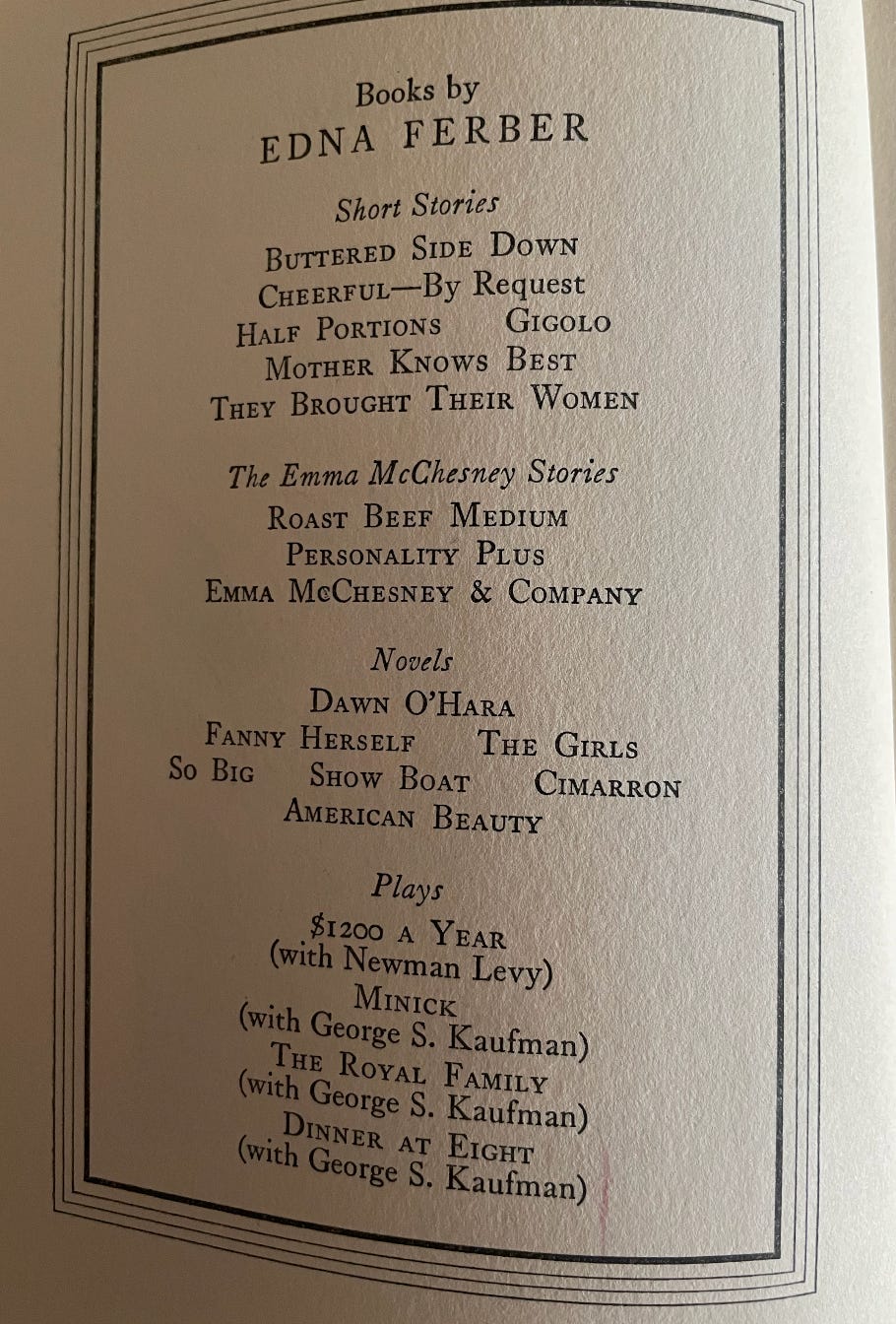The bibliography has convinced me to become a Ferber completist. More books ought to be called things like Buttered Side Down and Roast Beef Medium and CHEERFUL—By Request. I don’t know what I’ve been doing, calling my books other things; from now on I shall reform.
