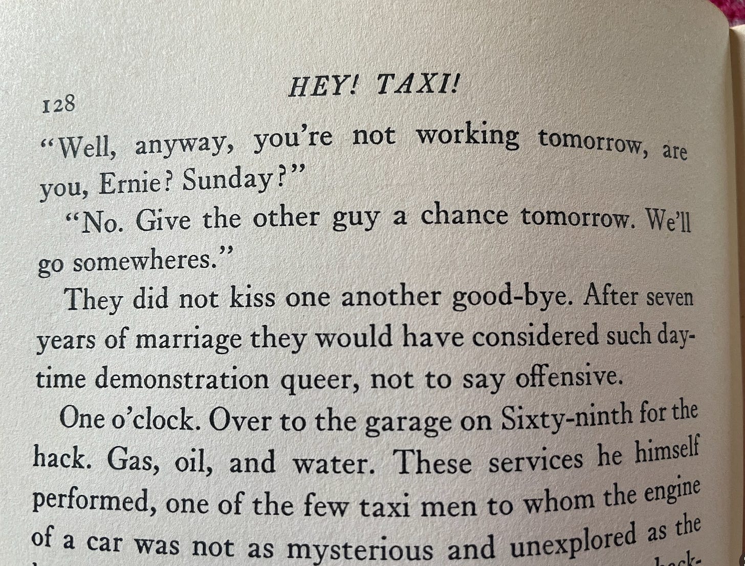 This story follows Ernie Stewig, a Manhattan cab driver who loves his wife but thinks kissing her goodbye in the morning would be queer, even “offensive”: