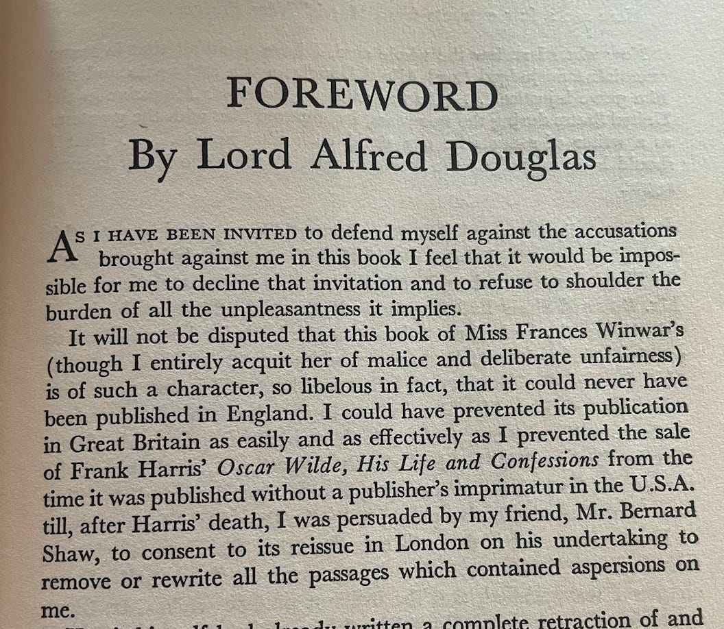 I recently picked up a copy of Frances Winwar’s 1941 Wilde biography, Oscar Wilde and the Yellow Nineties, not for the biography itself but for the hostile forward written by Lord Alfred Douglas, which I can only imagine Winwar’s publisher forced into the book after the threat of legal action.