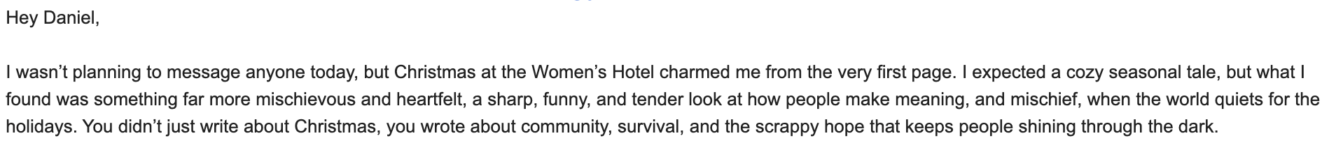I ought to know what I’m reading from the first line, but it took me until “but what I found was something far more mischievous and heartfelt” to find my bearings. “Hey Daniel, I wasn’t planning to message anyone today” sounds so friendly and casual. I often hope I’ll get through the day without emailing anybody, too!