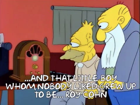 I came to a number of widespread-but-already-fading 20th-century cultural touchstones indirectly — as I think did many of my generation — mostly through Peanuts and The Simpsons. The first time I heard the Roy Cohn gag in the “Homer’s Barbershop Quartet” episode (season 5, aired 1993), I didn’t know who Roy Cohn was, but I understood the cadence of the joke and the implication of the old-fashioned radio.