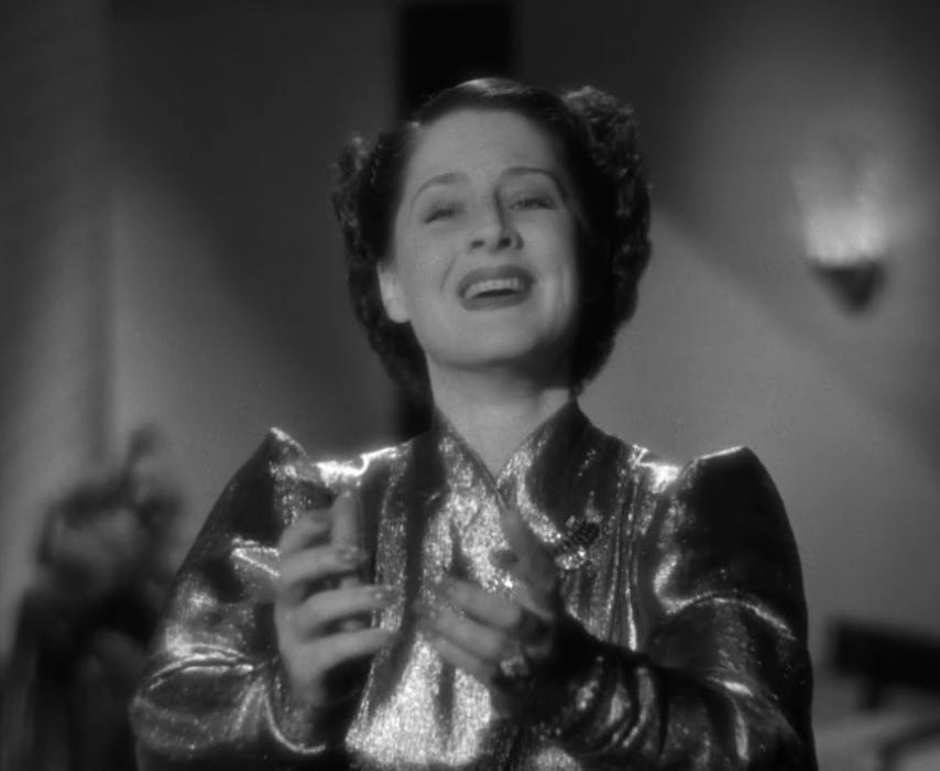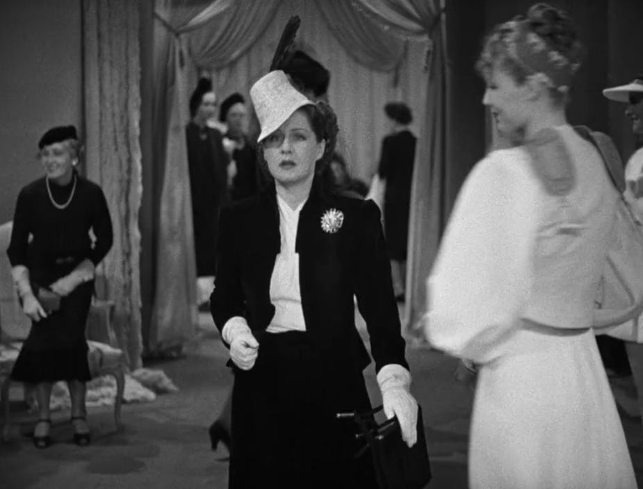 Immediately after this line is the first of Mary’s two Ecstatic Walks Towards Transcendence — one towards a dressing room (the gowns-by-Adrian version of Catherine of Siena’s anchoritic cell) just before the movie hits the hour-mark, and one towards her restored husband at the denouement. Mary has no time to indulge the false consolation of her faithless friends, not when there are clothes to draw near to! Her tears are not to be wrung out on the weak and feeble shoulders of mortal women, but for Style alone! A beautiful and unbroken tracking shot follows her stricken, enduring countenance as she moves from company to solitude, from waiting to dressing, from earthly comfort to the armor of God, all without shedding the tears that have been misting up her vision without falling for the last twenty minutes – a Sidney Carton at Sydney’s Salon.