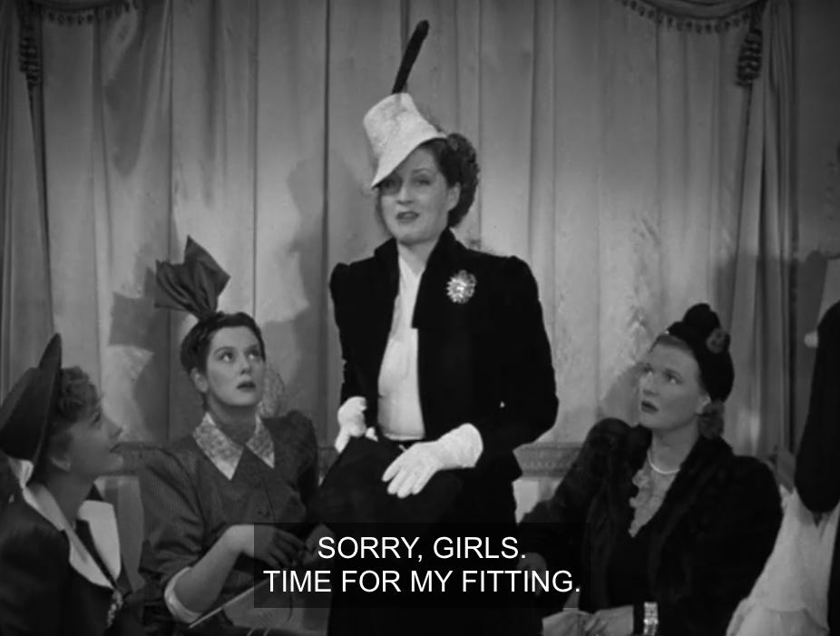 [Mary’s weak-willed friends realize she’s just had an evening gown snatched out from under her by her husband’s mistress and beg her to make a scene] Sorry, girls. It’s time for my fitting.