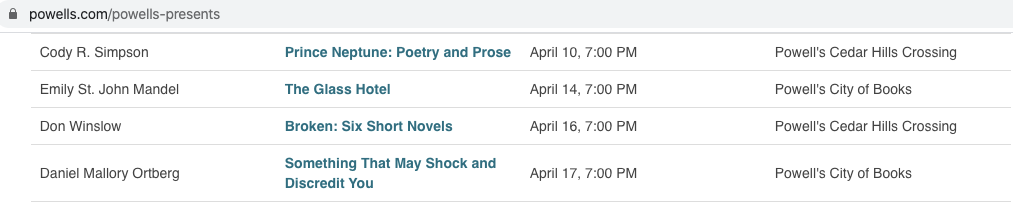 Friday, April 17th at Powell’s Books in Portland at 7pm. It’s not yet on the calendar, but here’s a screenshot of the Presentation lineup for proof.